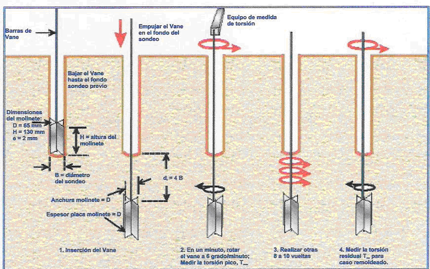 Consiste en la hinca en el terreno de un molinete (Vane Test) constituido por cuatro palas rectangulares de lamina delgada de acero, ortogonales entre si y solidarias a un varillaje y medir el par de torsión T al girar el dispositivo hasta la rotura del terreno. La altura (H) de las paletas es dos veces su diametro (D)